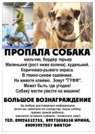19.01.2018 / ru-585373 пропала собака — ВолгоградПропала собака, бордер терьер, мальчик, рост ниже колена, худенький, окрас коричнево-рыжий, недоверчив к незнакомым, добрый. На животе клеймо. БОЛЬШОЕ ВОЗНАГРАЖДЕНИЕ!!! |