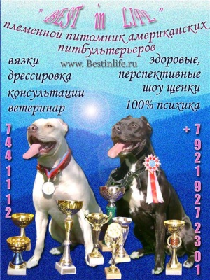 Питомник занимается разведением собак породы американский питбультерьер более 6 лет. Наши собаки уравновешенные, темпераментные, отлично дрессируемые и высокого экстерьерного класса. Питомник оказывает всестороннюю помощь владельцам наших собак.