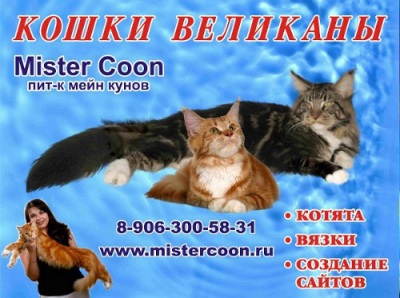 Наш сайт питомника породы кошек мейн кун. Питомник, mistercoon.ru, занимается разведением кошек и котов породы мэйн кун.На сайте можно посмотреть фото котов, кошек и котят майн- кун. Вы можете купить котенка мейн кун в нашем питомнике. Мейн- куны это кошки, напоминающие своим видом дикую рысь.