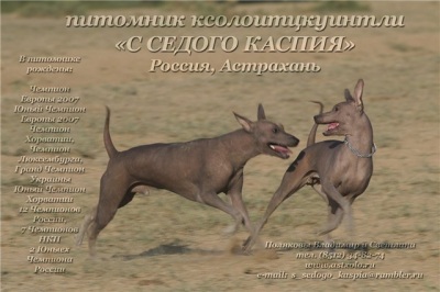 Первые собаки породы ксолоитцкуинтли или мексиканской голой собаки были приобретены нами в 1997 году, от которых было получено несколько пометов. Официально в FCI питомник был зарегистрирован в 2002 году - свидетельство № 4808 от 01.04.2002 г. За 13 лет кинологической работы нам удалось получить и генетически закрепить свою племенную линию высокого породного уровня. Ксолоитцкуинтли «С Седого Каспия» неоднократно становились лучшими на монопородных выставках в Москве, Ростове-на-Дону и Астрахани. Среди собак, полученных в питомнике, есть удостоенные титулами: чемпион Европы 2007, юный чемпион Европы 2007, чемпион Хорватии, юный чемпион Хорватии, грандчемпион Украины, 15 чемпионов России, 15 чемпионов национального клуба породы, и это далеко не полный список титулов, полученных на выставках различного уровня. Все собаки питомника являются прекрасными производителями, проверенными на потомстве, передающими детям свои лучшие породные качества. Деятельность питомника направлена не на массовое разведение ксолоитцкуинтли, она предполагает качественное улучшение породной линии с учетом требований стандарта, современных тенденций и сохранения жизненно важных физических и физиологических признаков животных данного вида. Результатом одного из наших последних реализованных проектов стало рождение щенков от кобеля из питомника «Caliente» Мексика.
