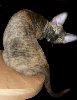 * У них ушки - бабочки и волнистая, короткая шерсть - как каракульча, кошка вся в волнах-завитках, но шерсти ни на одежде, ни в квартире нет!