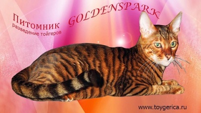 Питомник GOLDENSPARK. Питомник зарегистрирован в TICA – № 23462. Питомник ещё молодой, но я поддерживаю отношения с более опытными заводчиками, которые делятся со мной опытом и полезной информацией. Все животные в питомнике окружены заботой и лаской. Котята продаются привитыми и приучеными к туалету. Обязательным правилом питомника является соблюдение чистоты породы и тщательный подбор производителей по фенотипу с анализом и подбором определенных линий тойгеров. Поэтому животные для разведения продаются только в питомники или людям которые согласятся работать в системе моего питомника. Все остальные животные подлежат обязательной кастрации(стерилизации) и продаются в качестве домашних любимцев.