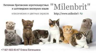 Питомник британских короткошерстных и шотландских вислоухих кошек «Milenbrit» был основан в 2007 году и может по праву гордиться многолетним опытом в фелинологической работе. При покупке котенка, хозяева получают исчерпывающую информацию по содержанию и уходу за маленьким питомцем, а так же консультации в первые месяцы, так что вы не окажетесь оставленным один на один с возможными вопросами, возникающими в процессе ухода за своим шотландским котенком.